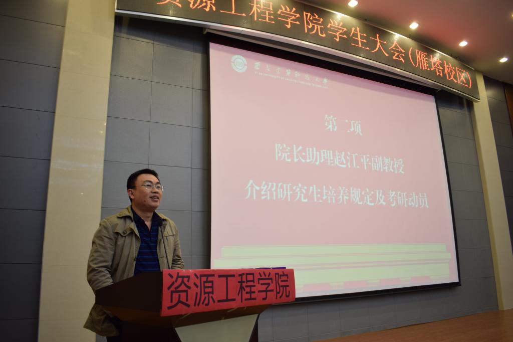 接着,资源工程学赵江平副教授发言,他首先解读了现行研究生培养规定,提出比分球探 对研究生培养改革的趋势,将逐步引入末尾淘汰制,希望广大研究生能明确目标,积极参与科研项目,尽快进入状态,不忘读研的初心。同时,赵江平副教授向同学介绍了2018年考研的报考与录取情况,为大三学生做了考研动员,希望同学们明确目标早日备考,鼓励大家报考本专业研究生,并祝愿同学们取得优异成绩,考入理想院校。