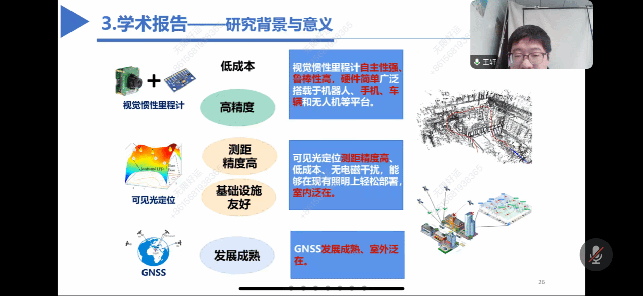 王轩博士在学术报告中介绍了基于视觉惯性里程计驱动的人车一体定位技术研究,利用多传感器融合算法实现了高精度的人车一体定位系统构建。介绍了复杂环境下车人相对位置精准测定,动态场景中定位精度优化策略,并将视觉惯性里程计的定位优势拓展到室内外无缝切换场景中,增强了技术实用性。