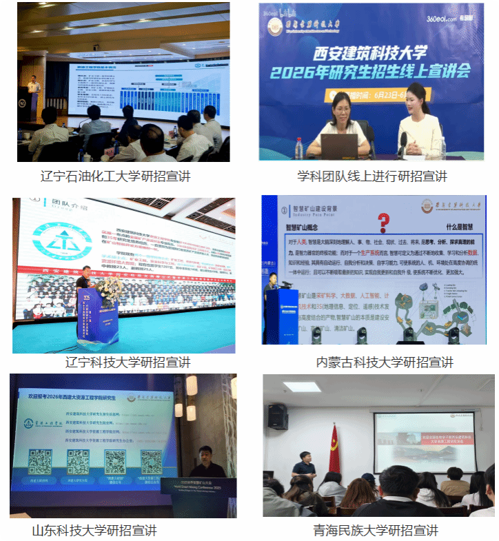为吸引优秀生源,提升研究生招生质量,比分球探 持续开展2026年研究生招生宣传工作。5月-9月期间,招生工作领导小组组长顾清华教授、副组长江松教授、各学科团队通过线上、线下的方式先后赴青海民族大学、山东科技大学、辽宁科技大学、西藏大学、内蒙古科技大学、辽宁石油化工大学6所高校开展研究生招生宣传。