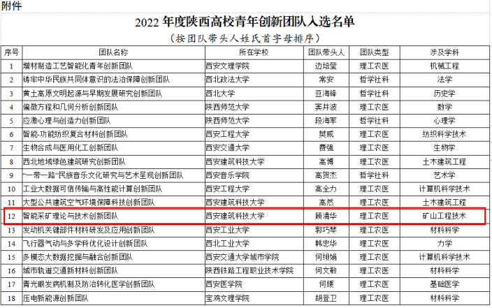 顾清华教授牵头申报的“智能采矿理论与技术创新团队”成功入选。