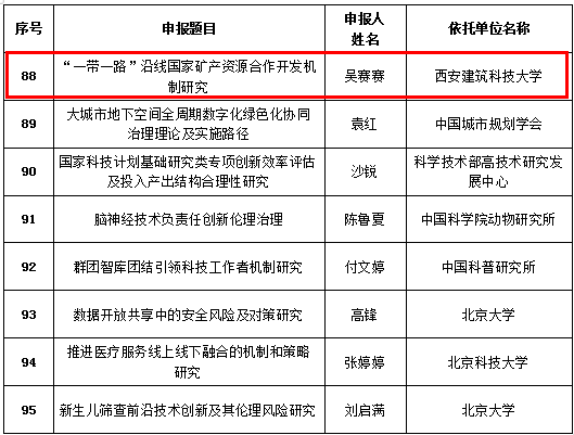 近日,中国科协发布了2023年度“科技智库青年人才计划”评审结果,经组织专家形式审查和综合评审,共评选出立项项目120项,球探足球比分网 吴赛赛副教授申报的项目“‘一带一路’沿线国家矿产资源合作开发机制研究”批准立项。