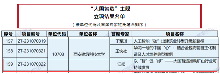 江松教授牵头,卢才武教授、顾清华教授重点参与,联合国内知名矿山企业申报的《以“智”促“绿”——大国智造推动矿山行业可持续发展》(ZT-231070322)项目获批“大国智造”主题立项。