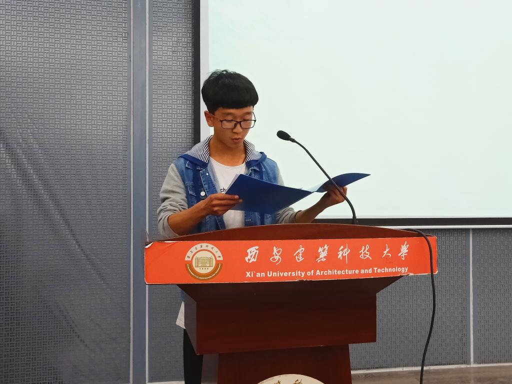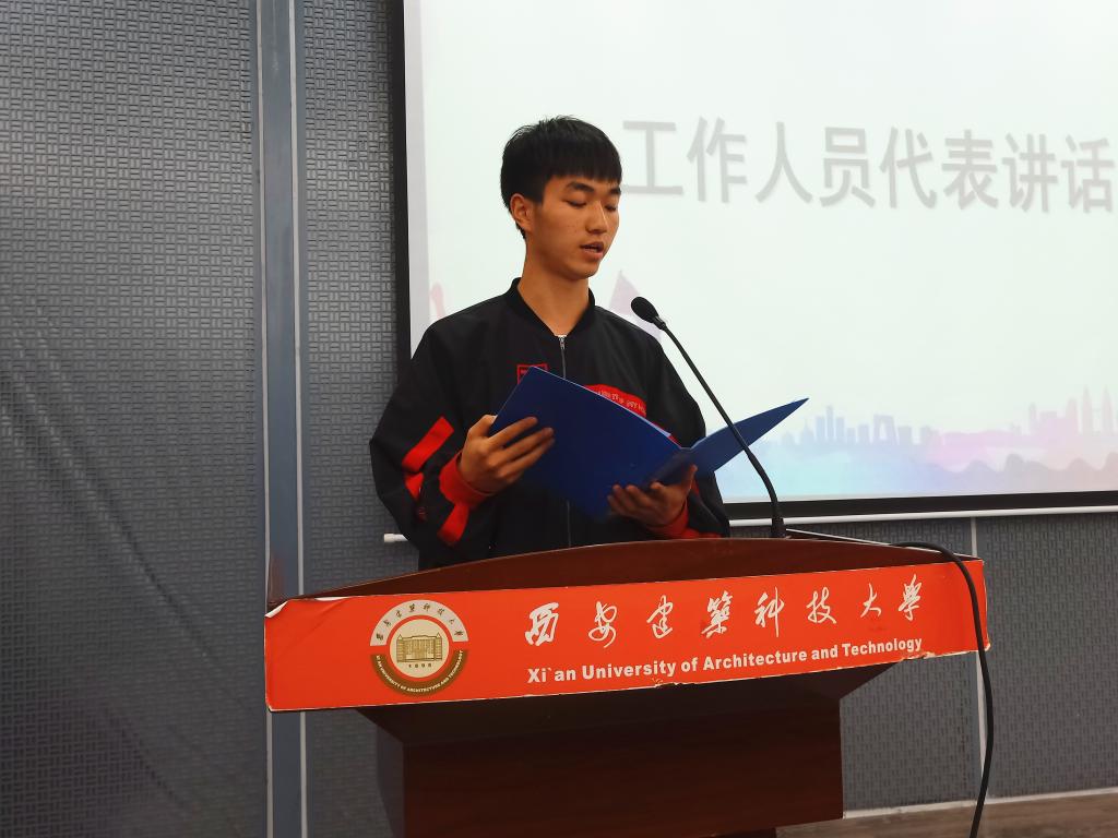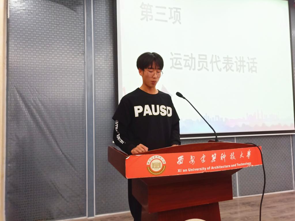 运动员代表闫春涛同学上台发言,他提到运动会是对运动员身体素质、心理素质、运动水平的一种检测和提升的方式,是团结精神、奋进精神、奉献精神的体现途径。为了表示对庄严的运动会的重视及尊敬,他代表全体参赛运动员就公平竞赛、遵守规则、奋勇拼搏力争荣誉做出郑重宣誓。工作人员代表殷书檀同学也就近日来的后勤工作、服务保障做出工作总结并且对参赛运动员们给予真挚的鼓励和期望。