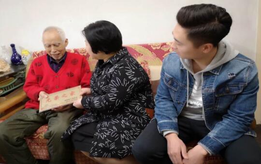 走访完蔡天宝老人住所后,一位满头白发坐着轮椅的老爷爷主动来到了社区领取光荣牌。老人不顾身体原因,坚持亲自领取。当那双颤巍巍的手捧着“光荣之家”门牌时,老人激动的心情感染了在场的每一个人。在护送老人家回家的路上,听他讲起那段峥嵘岁月,才知道这位退役老兵经历过多场战争,逝去的岁月没有冲蚀掉他身上战斗过的痕迹,愈发凸显出军人的气魄与精神。