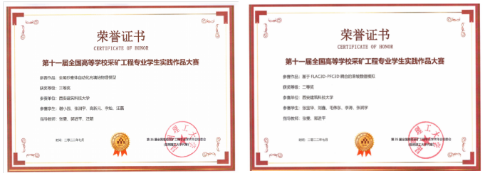 获奖情况:获第十一届全国高等学校采矿工程专业学生实践作品大赛三等奖和二等奖各1项;2021-2022学年“争先创优”优秀学生干部二等奖。