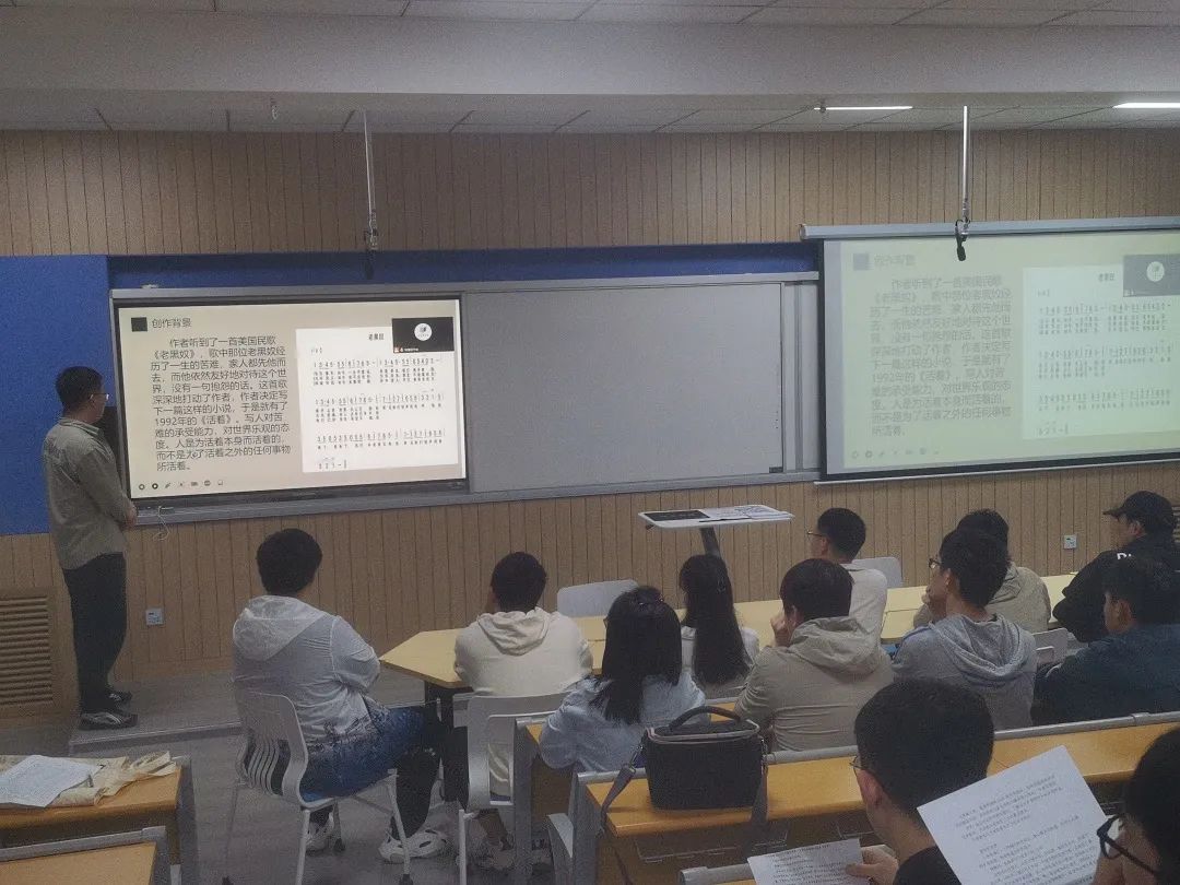 李浩东通过朗诵原文的方式带领着同学们领略史铁生在创作本书时的心境,感受着史铁生在人生低谷时的迷茫和对母亲那浓浓的思念之情。随着朗诵声音的落下,每一位同学的脸上都流露出忧郁神情,仿佛已经来到了那座荒芜冷落的古园,沉浸在文中无法自拔。