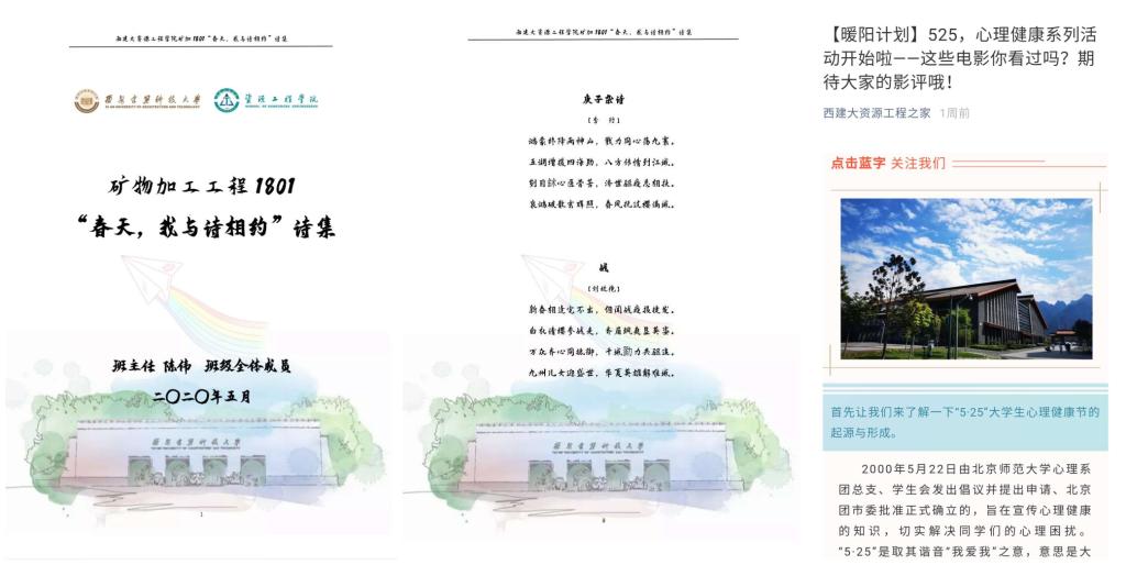 积极鼓励学生以文字、书画等表达内心,矿加1801班整理形成“春天·我与诗相约”诗集,收录25首作品,表达了疫情期间同学们的情绪状态。组织开展“525,心理影片赏析”活动,引导学生在观影中感受生活,在撰写影评中收获感悟。