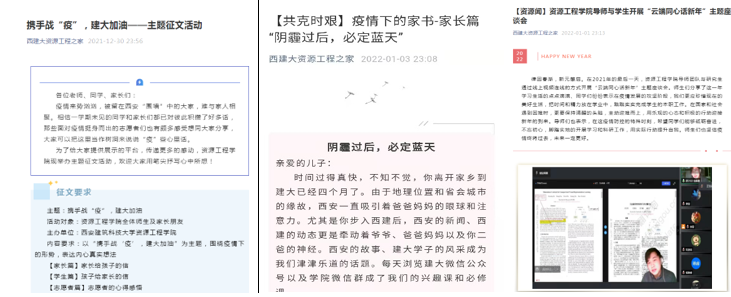 持续强化班主任、导师职责,推进“资源家文化”建设。在2021年最后一天,组织各班班主任、研究生导师、辅导员与学生齐聚网络开展“聚同心·共抗疫·勇担当·展形象”、“云端同心话新年”、“守望相助抗疫情,关心关爱见真情”等主题线上元旦联欢活动,关心关注学生在宿舍学习生活及心理健康状况,传递“资源亲情与温情”。