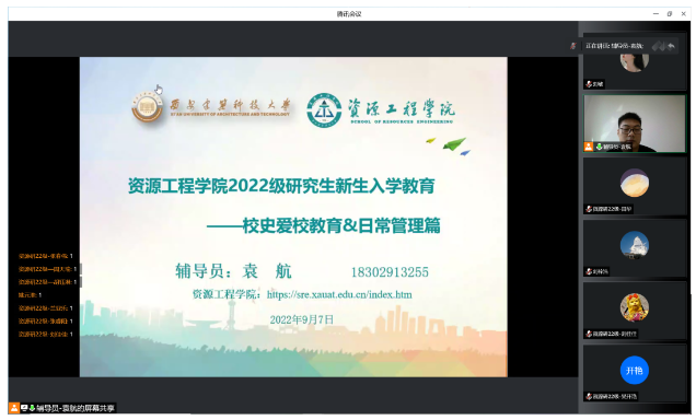 于2022年9月7日上午10:00通过腾讯会议举行了2022级研究生新生线上见面会。本次会议由2022级研究生辅导员袁航主持,2022级154名研究生新生及研究生会相关工作人员参会。此次会议由校史爱校教育、日常管理、安全教育三部分组成。