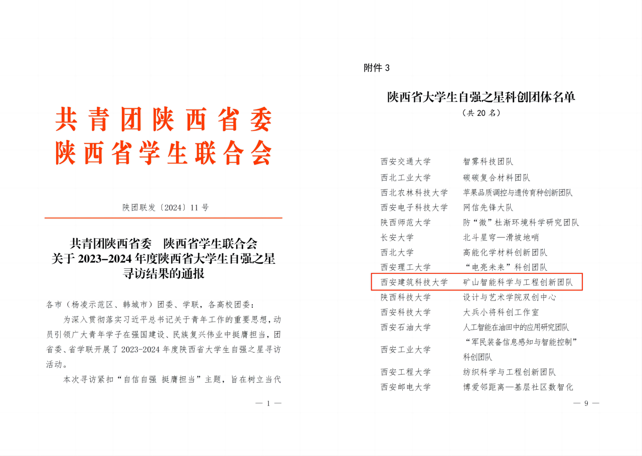 矿山智能科学与工程创新团队获2023-2024年度“陕西省大学生自强之星科创团体”称号。
