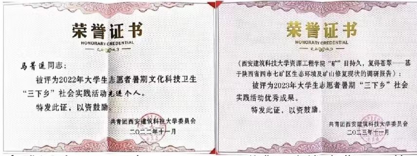 实践活动:2023年6月,开展围绕“双碳战略背景下的陕西省境内矿山环境与生态修复的调研与可持续发展策略研究”;2023年5月,陕西省哲学社会科学研究专项:人不负青山,青山定不负人理论与实践研究;2023.01贵金属高温矿定向通风与排水诱导结合、除尘降温控制热害的关键技术及示范应用——陕西省自然科学基础研究重点项目;2023.1空气过滤器更换周期检测平台的研发;2022年6月,马菁遥带领团队开展“复合空气过滤材料应用与再生性能研究营造宜居绿色城市建筑环境--2023新型城镇化青年观察计划”暑期调研;2022.05用于复杂交叉污染源的新型复合滤料关键技术及应用研究,2023第一批及第二批“科创西安”,2023双碳目标下高效多功能复合空气过滤材料的研发及应用研究,2022.09后疫情下针对交叉污染源多功能复合空气过滤材料的研发及应用研究。